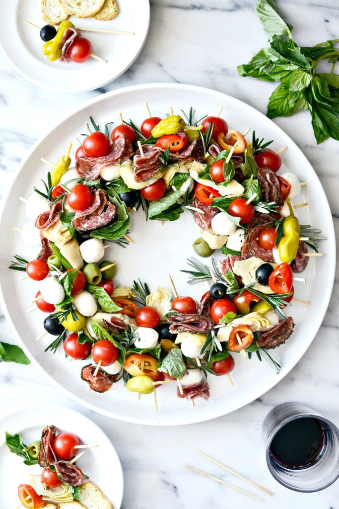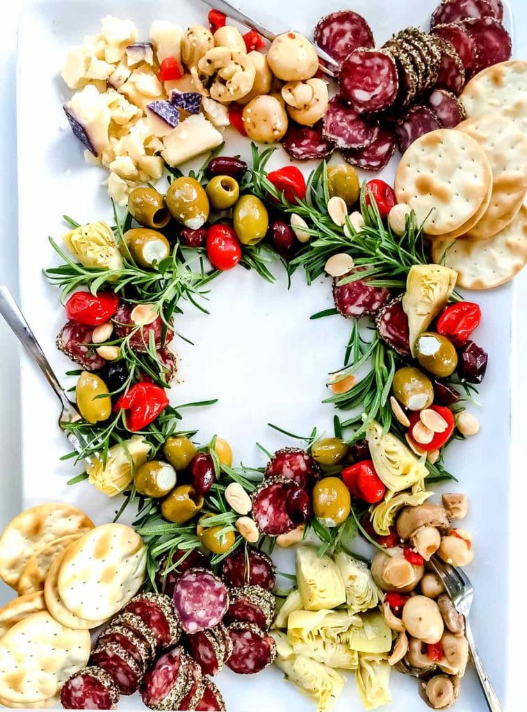 Don't restrict yourself to a typical charcuterie spread. Be creative and try something new, like an antipasto Christmas Charcuterie Wreath like this one by Foodie Crush.