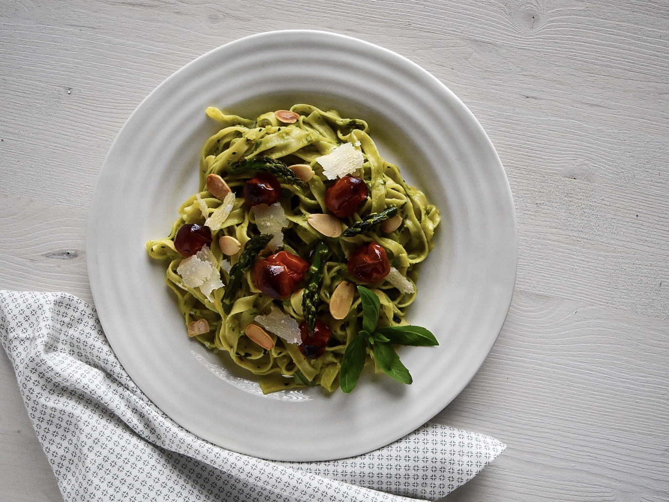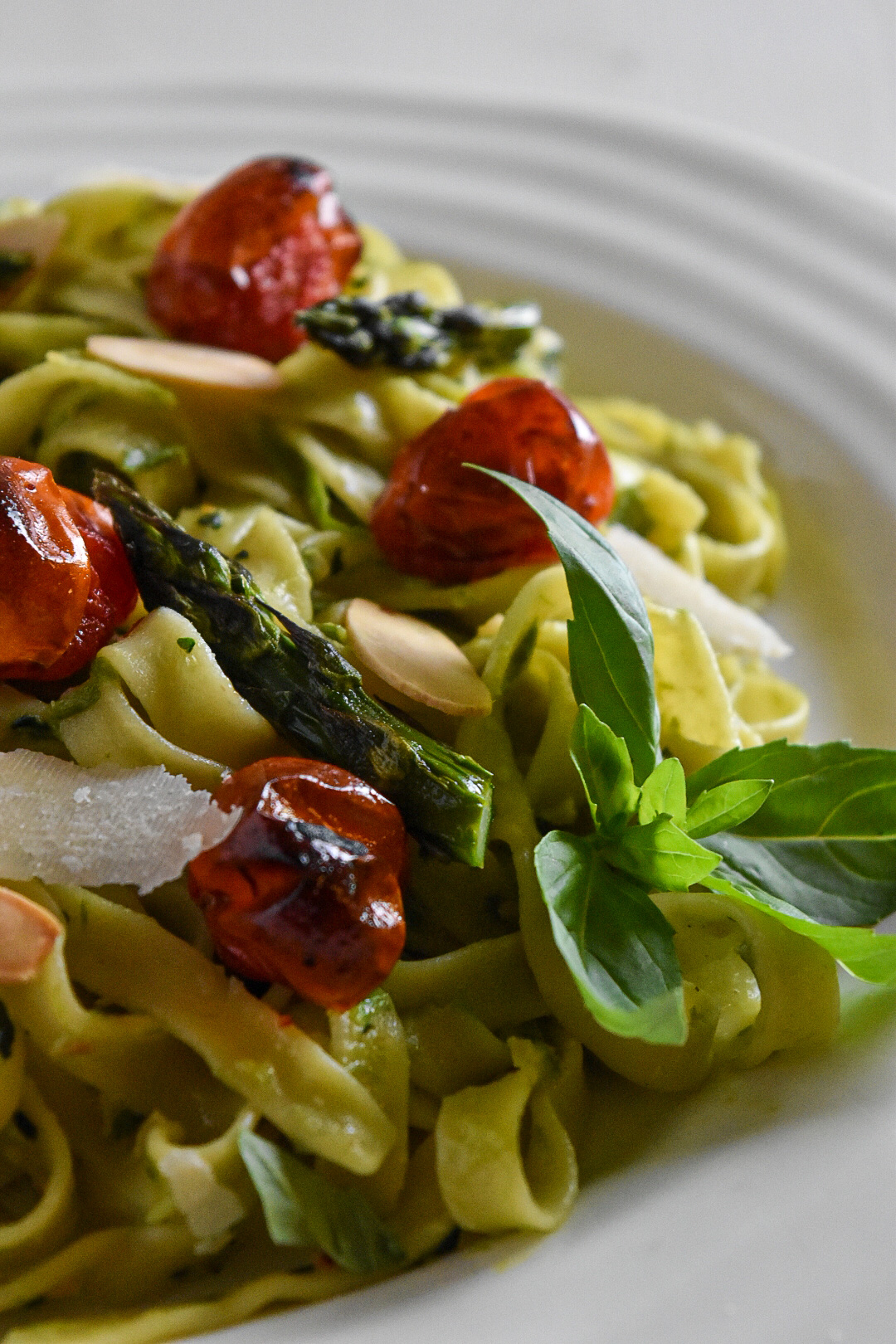 Enjoy the taste of spring asparagus with this simple pasta dish. The asparagus and almond pesto will leave you wanting more! While the roasted tomatoes add a nice sweet and acidic touch to the dish.
